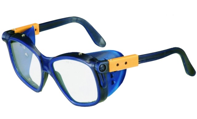 Ochranné okuliare s bočnými krytmi, plastový rámček modro-žltej farby